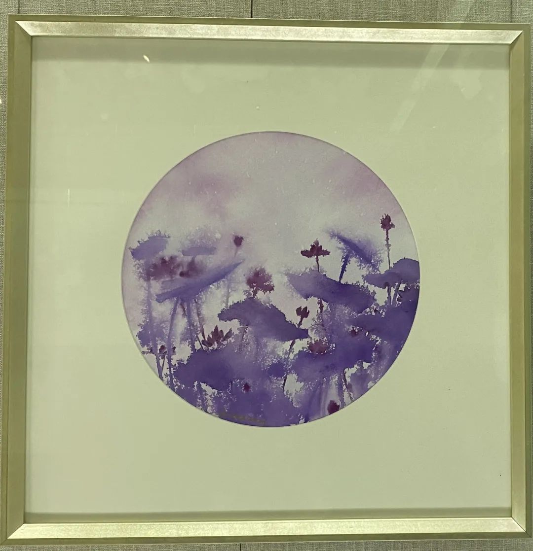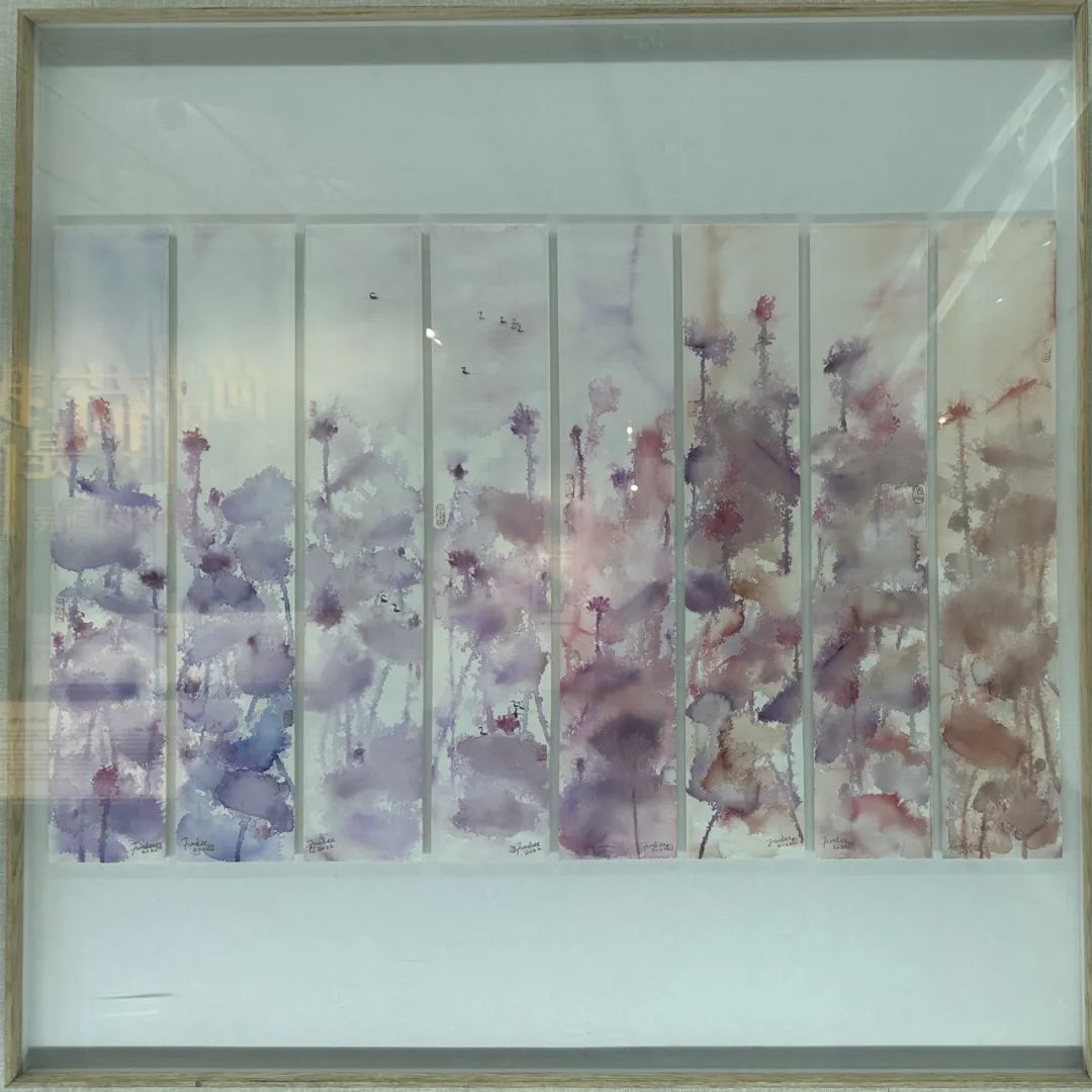 走进展厅,水彩画《荷是我闻》拨动了不少观众的心弦,作品打破了传统荷塘的粉绿着色,盛放的荷花、夕阳的余晖,“化作”打翻了的颜料,晕染在密密匝匝的荷叶上,用色大胆,使得荷叶宛若少女翻舞的罗裙,亦真亦幻。