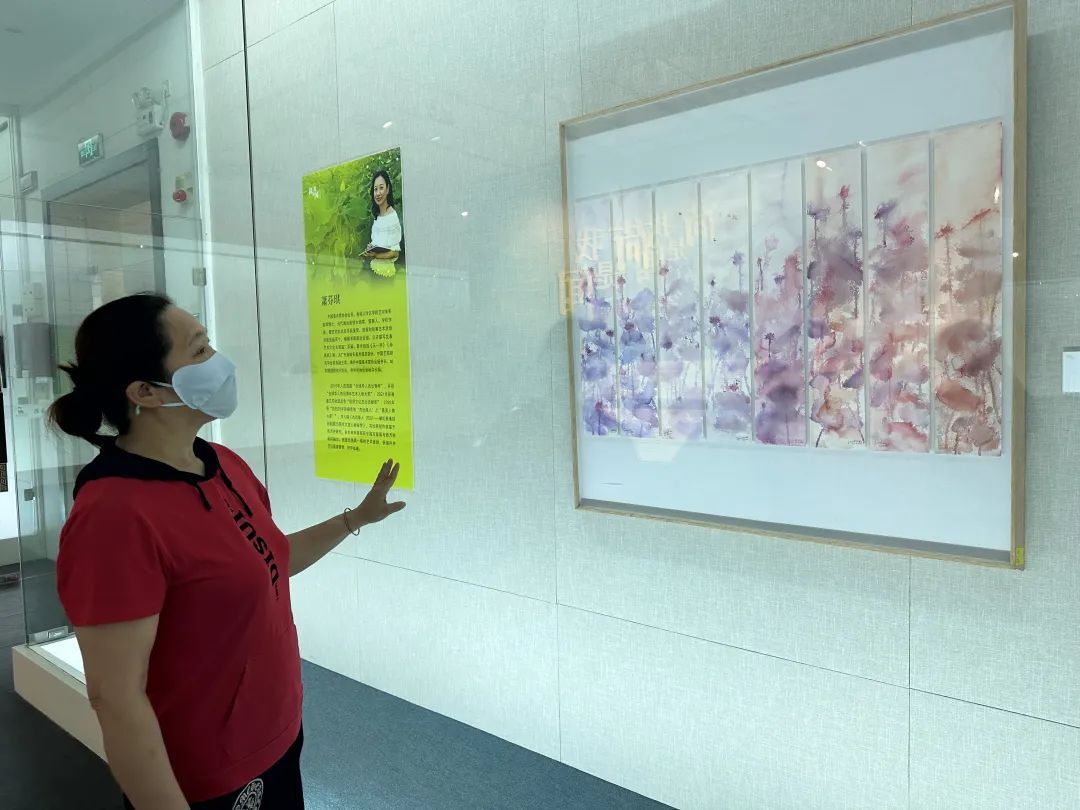 “这幅画中的荷塘,打破了原有的浓烈色调,以粉紫色为基础,再揉进夕阳的暖色,色彩的变化让人感到心情愉悦。”观众丁惠霞说。