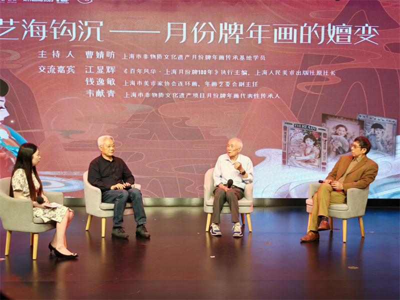 开幕仪式上,江显辉、钱逸敏和韦献青共三位月份牌艺术大师组成“月份牌年画特邀嘉宾团”进行现场交流对话,为观众带来月份牌穿越时空的历史故事。在三位艺术大师讲述中,月份牌历经百年沧桑与风雨的嬗变过程,犹如一幅画卷在观众面前徐徐展开,现场观众皆受益良多,不少人对月份牌年画艺术产生了浓厚兴趣,纷纷感慨道“原来月份牌这么有意思”。