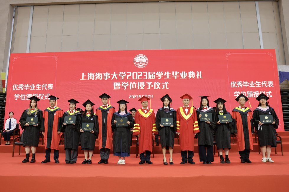 在毕业典礼现场,优秀毕业生代表依次走上主席台,从校领导手中领取毕业证书、学位证书,行“拨穗礼”。全体毕业生起立、举起右拳庄严宣誓:“传承忠信笃敬校训精神,坚守海洋强国、航运强国理想,奋楫扬帆、破浪前行,为全面建成社会主义现代化强国贡献青春力量!强国有我,请党放心!”铿锵有力的誓词响彻全场。