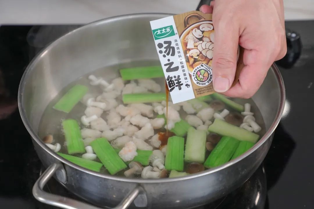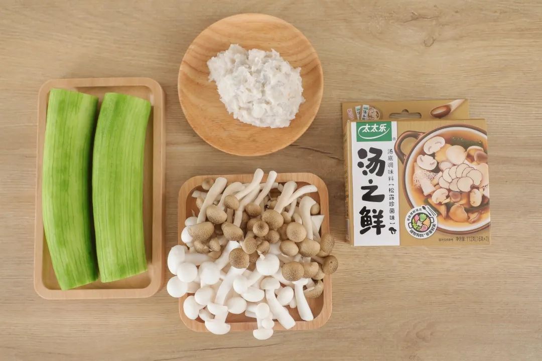 丝瓜200克,白玉菇50克,蟹味菇50克,虾滑50克,松露珍菌味调味料32克。