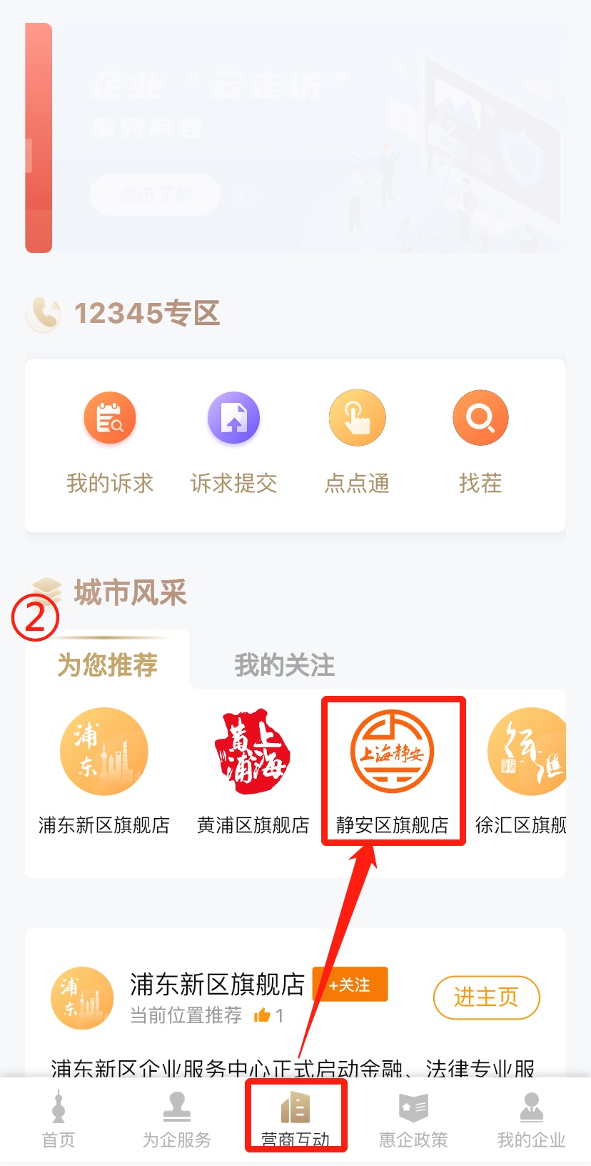 首先,下载“随申办”企业云APP,通过登录“随申办”企业云APP,搜索“静安区旗舰店”并进入。