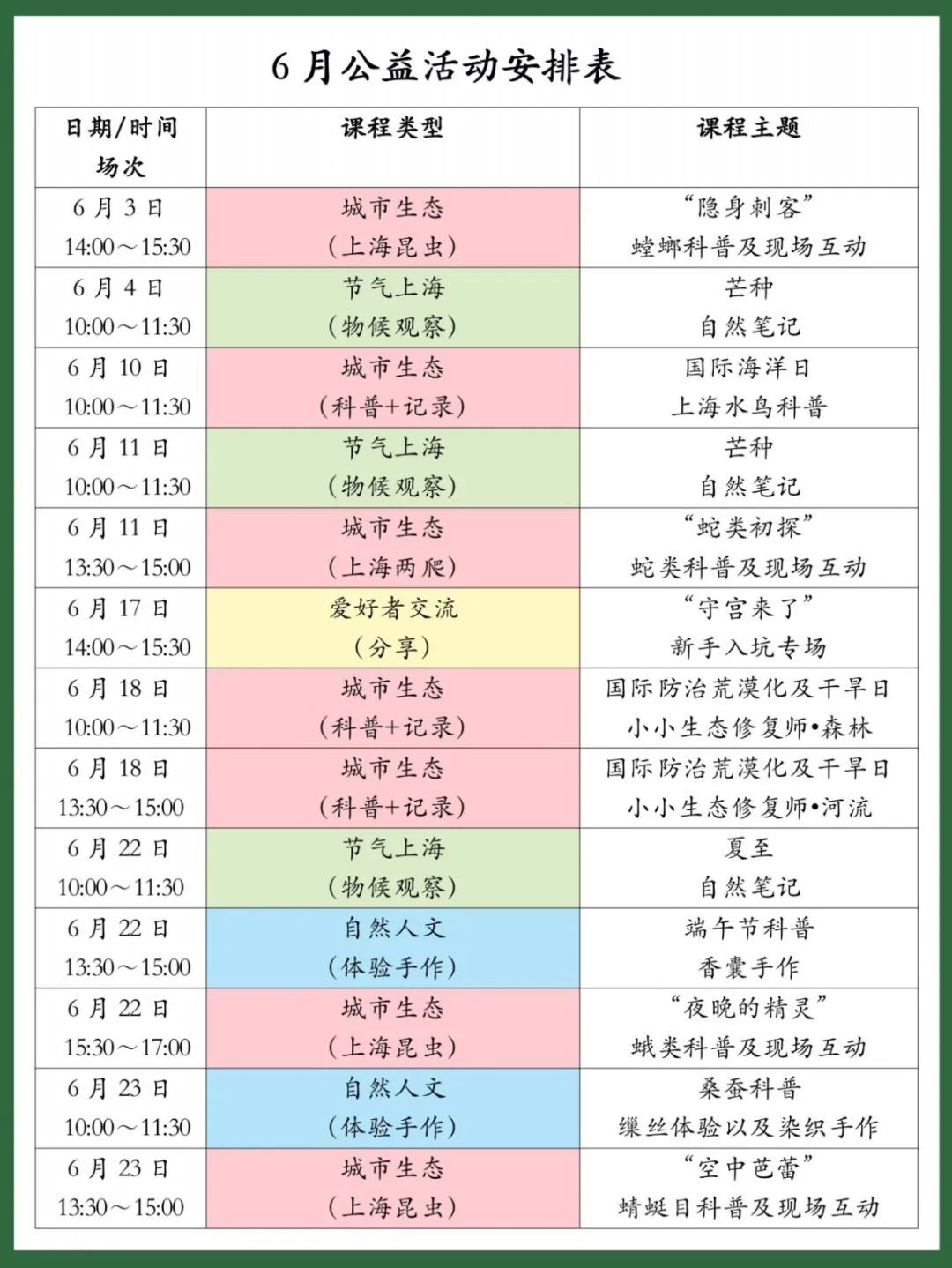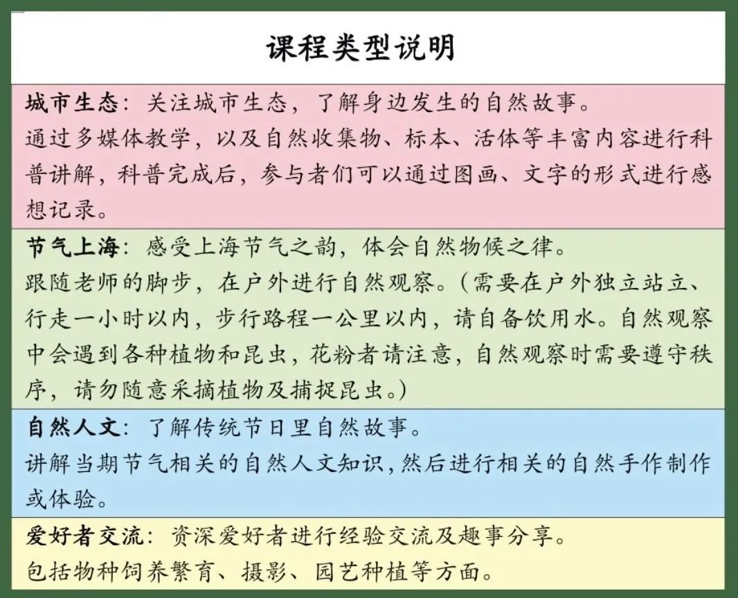 6月份,自然中心还将持续开展“城市生态”“节气上海”“自然人文”三大主题系列课程: