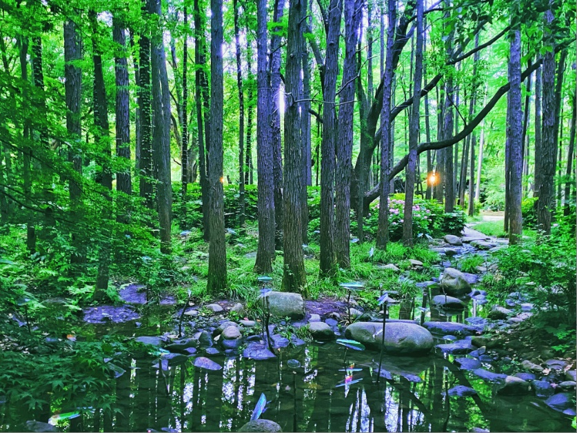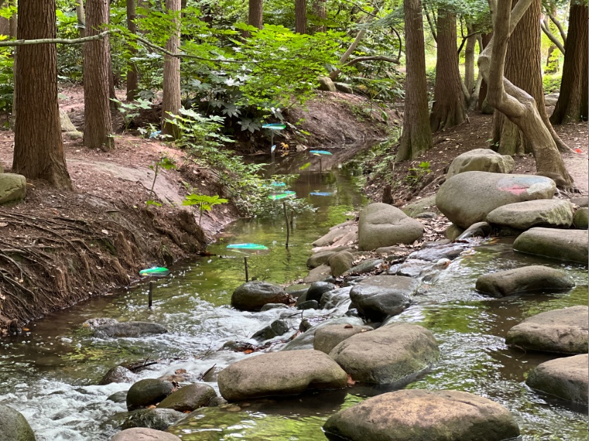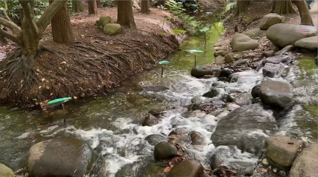 当微风吹过,阳光穿透林冠洒在风车上时,风动鲤鱼便随风转动,并在水面上投射下五彩光影,仿佛一条条“锦鲤”在溪水上游动。原本了无生气的枯枝在风车、溪流、森林、阳光的共同作用下,如“枯木逢春”般再次焕发蓬勃生命力,通过一静一动的强烈对比,充分展现了生命循环不息,欣欣向荣的自然生态之美。