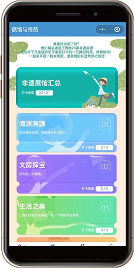 小程序提供每个展馆的详细介绍和所涉非遗项目的知识,每月更新各展馆当月的公教、美育活动信息,此外还设置打卡、集章、组队PK等趣味功能。用好小程序,游览体验会更丰富。