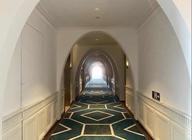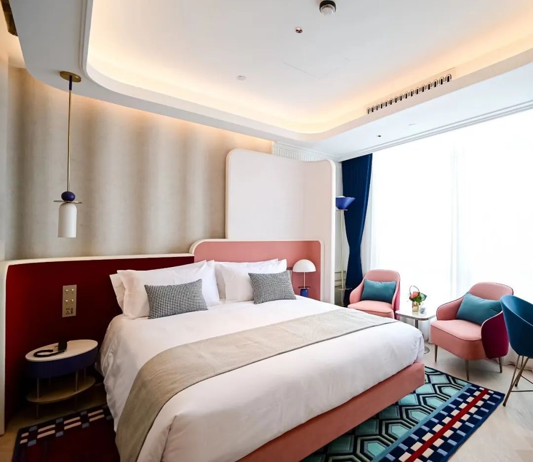 三层至六层则是客房区域。无论是价格亲民的基础房型,还是温馨的家庭套房,都融入了西式古典戏剧和中式电影元素。舞台式灯具、复古版地毯、撞色的搭配……让人如临文艺复兴时期的剧院。房外过道更是别具一格,仿佛一条时光隧道。