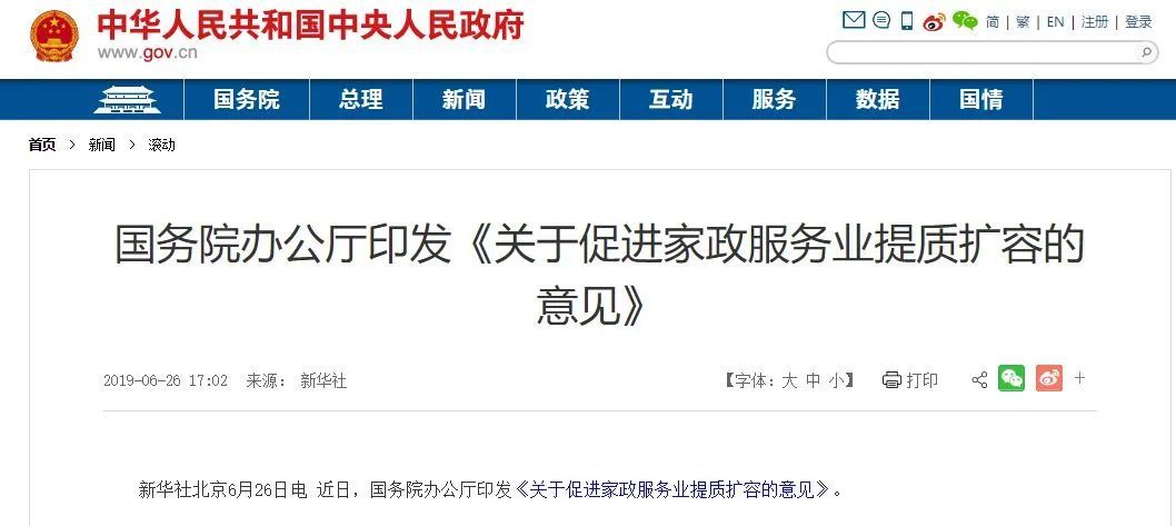 2019年,国务院办公厅印发《关于促进家政服务业提质扩容的意见》。