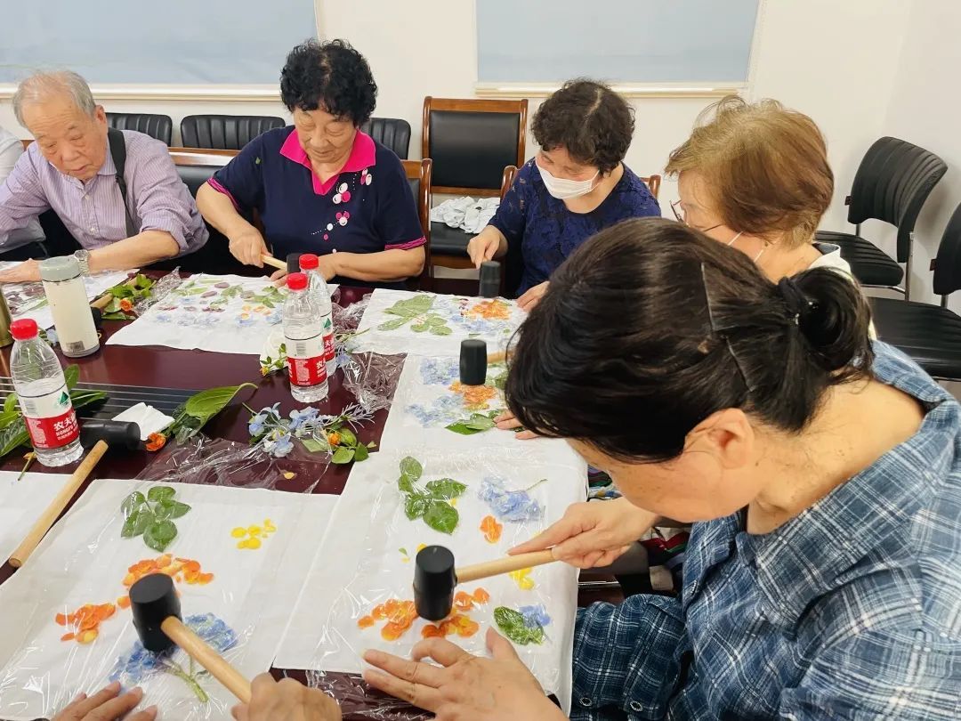植物拓染是我国传统的植物染色非遗技艺,以植物的根、茎、花、叶、果实、果皮等为染料,通过固色、布局、敲打的敲拓工艺手法,将植物的颜色、轮廓及脉络纹理拓印下来。在手工老师的指导下,居民们开动脑筋,将绿叶、花朵等植物摆放成自己喜爱的图案,并用保鲜膜进行固定。