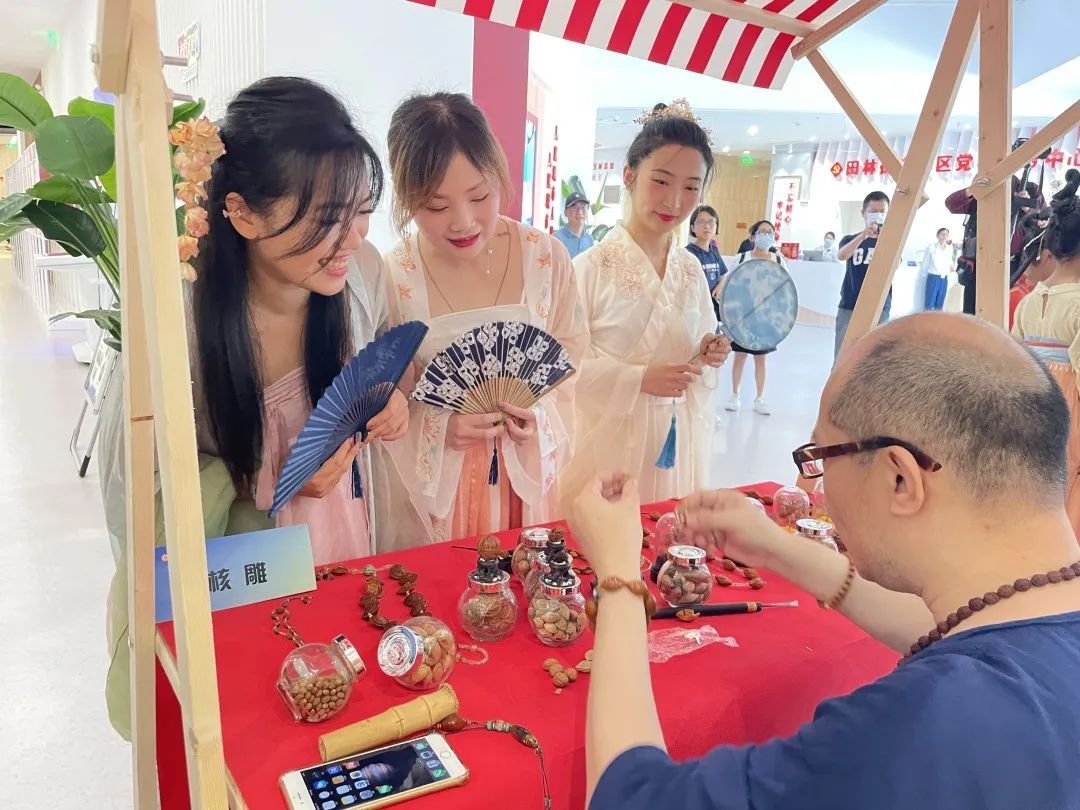 社区居民与非遗传承人零距离互动交流,体验非遗、玩转非遗,精美的非遗作品让传统文化焕发出时代的活力。不少市民特地身穿古装前来打卡,在游园的过程中被传承手艺人精湛的手艺折服,沉浸式体验传统非遗文化,感受浓浓的特色文化内涵和生活气息。