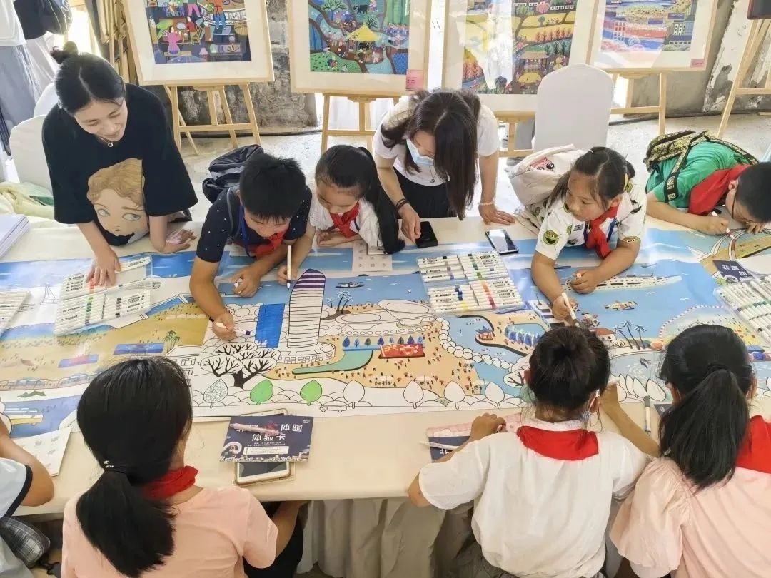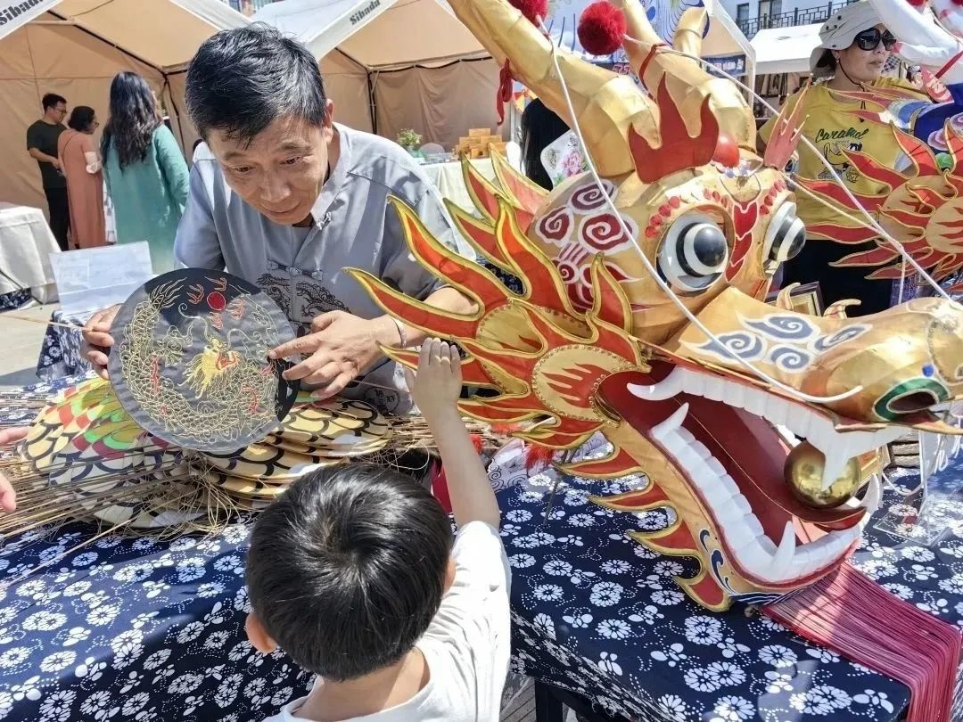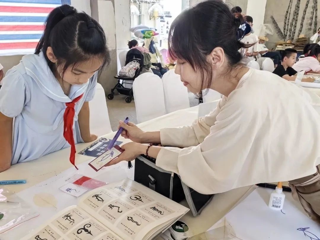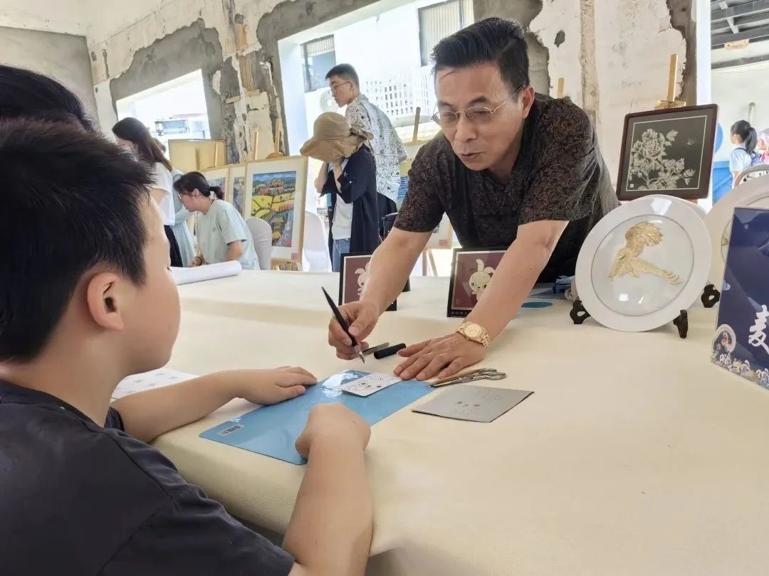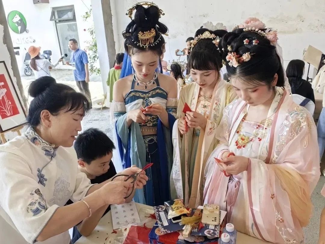 活动现场,人头攒动,热闹非凡,不少身穿汉服的游客穿梭在各个非遗体验项目的摊位之间,体验各种非遗技艺。金山农民画、甲骨彩绘、宋代点茶、剪纸、盘扣、刺绣等12个非遗体验项目,内容精彩纷呈,吸引了市民游客争相参与。其中,宋代点茶吸引了不少小朋友的目光,在非遗传承人的指导之下,孩子们学习用茶筅击拂打出泡沫。有游客表示,以前从没接触过,今天体验过后觉得特别有趣。
