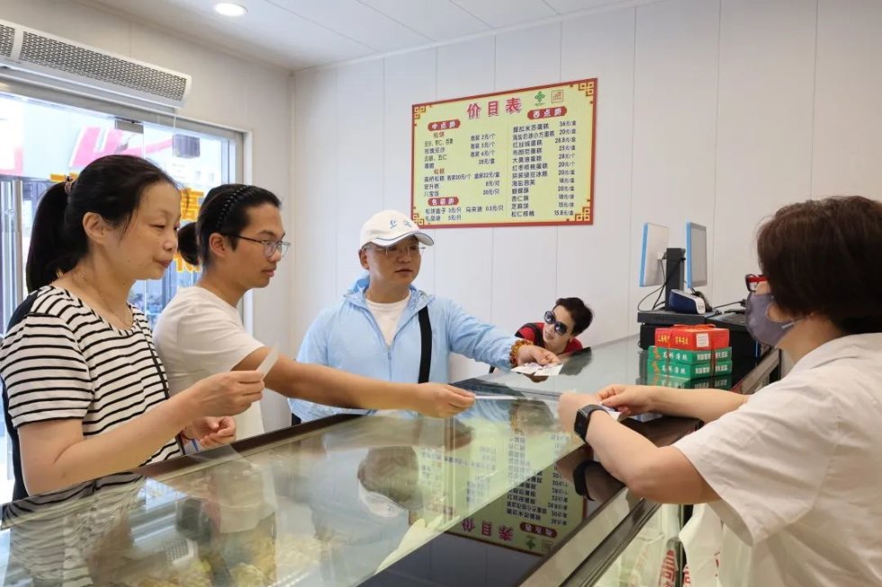 6月10日当天到访高桥老街的游客,即有机会获赠一张高桥松饼免费品尝体验券。领到体验券的游客们在老街的高桥松饼专卖店前排起了队,拿到松饼后更是迫不及待地品尝。“这家松饼不错,皮酥底薄,豆沙馅的甜度也适中。”游客朱阿姨品尝完以后,当即又买了两盒带回家。