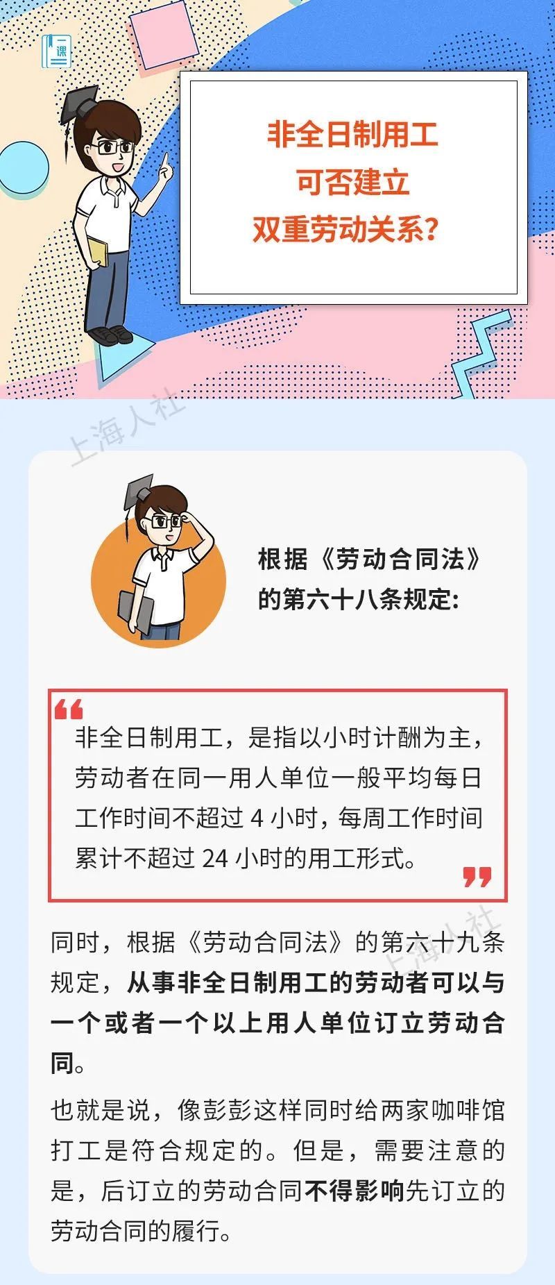 一直怀揣咖啡师梦想的彭彭最近有点忙。这不,他上午8-11点在A咖啡馆工作,下午1-4点在B咖啡馆工作,周六休息。彭彭与两家咖啡馆约定的都是非全日制用工形式,工资都是每小时35元。那像彭彭这样的非全日制用工,可以同时与两家单位建立劳动关系吗?一起来听听仁仁博士怎么说——