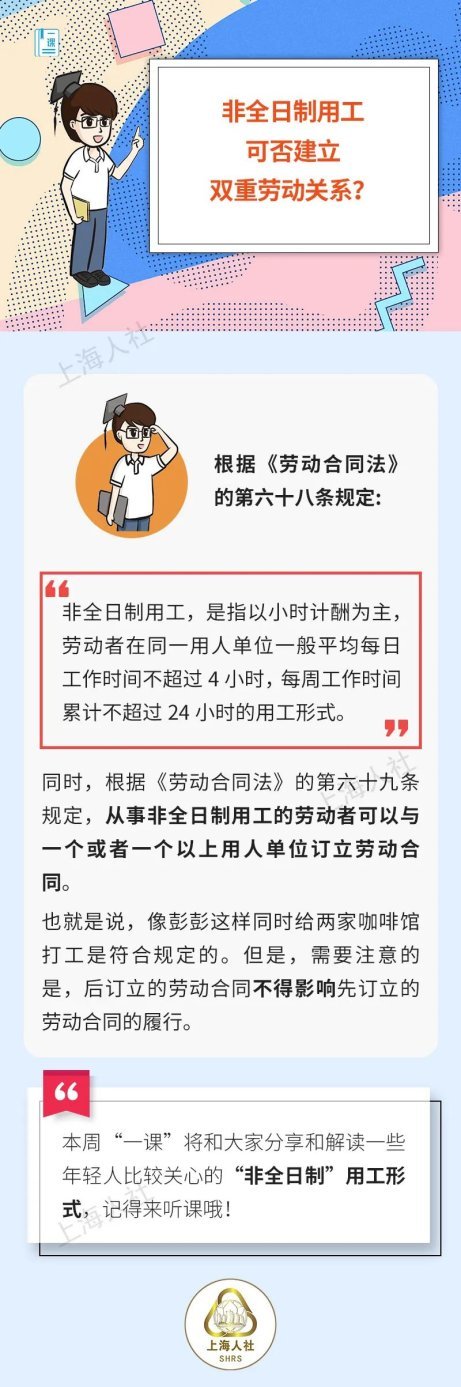 一直怀揣咖啡师梦想的彭彭最近有点忙。这不,他上午8-11点在A咖啡馆工作,下午1-4点在B咖啡馆工作,周六休息。彭彭与两家咖啡馆约定的都是非全日制用工形式,工资都是每小时35元。那像彭彭这样的非全日制用工,可以同时与两家单位建立劳动关系吗?一起来看↓