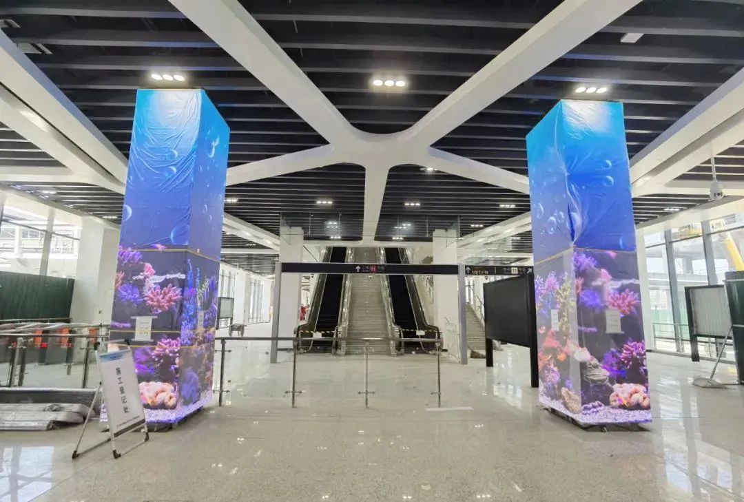 车站整体装修也基本完成,天花板上铺满LED灯,抬头仰望,仿若置身于星空下徜徉。现场还有部分大型光电玻璃屏幕正在安装,届时可以通过这些环绕站厅的屏幕展示更多昆山元素,科技感十足。