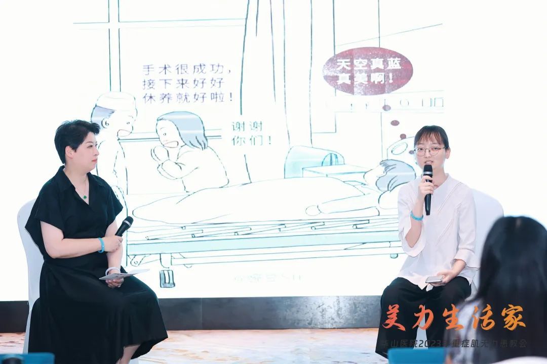 两位重症肌无力患者小张和小黄分享了自己的心路历程,虽然当天讲话仍然带着些许鼻音,但是现场每个人都为她们的心态以及同医护共同作战的信念所感染,场下掌声连连。