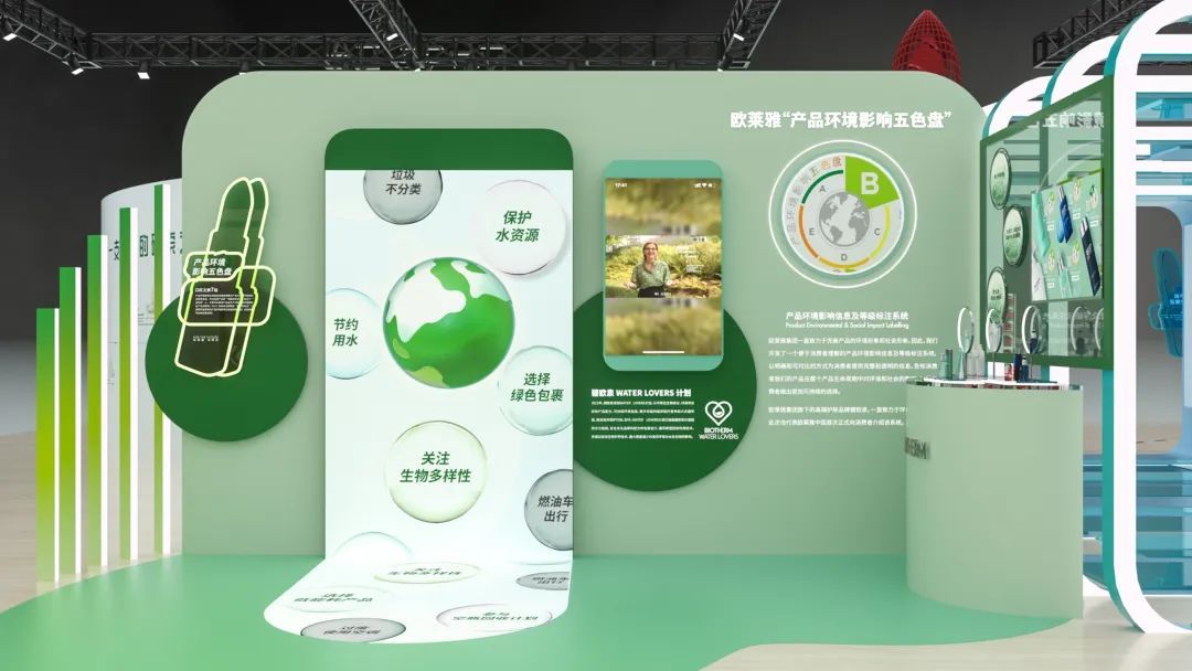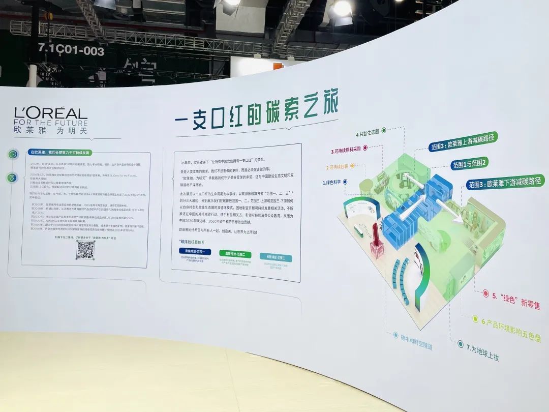 在本次碳博会的筹办过程中,欧莱雅始终践行可持续发展理念。除展台荣获碳中和达成认证声明外,欧莱雅亦引入了温室气体核算体系的碳排放范围概念,将展台分为范围1和2、范围3-上游、范围3-下游三大区域,充分体现其在可持续发展方面推动自身变革与赋能上下游生态圈的“双引擎”模式。