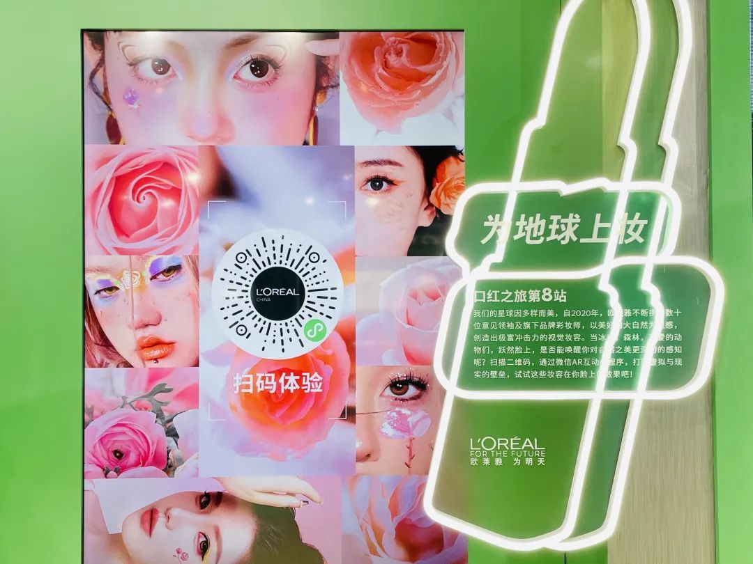 入口处醒目的“网红”艺术装置是欧莱雅展台的一大亮点,诠释了欧莱雅此次参展的主题:“一支口红的‘碳索’之旅”,传递着欧莱雅对地球的爱和梦想。
