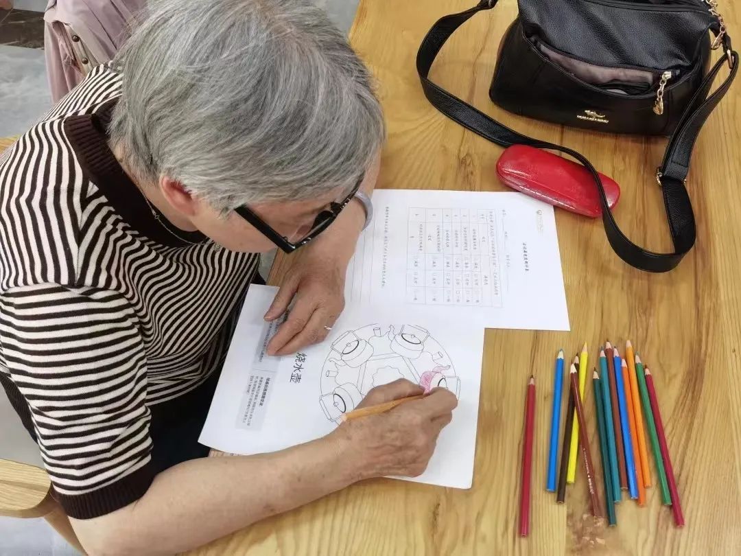 通过老师的讲解和示范,老人们沉浸在音乐律动操所带来的愉悦氛围之中,通过全身放松冥想,再伴随着轻柔舒缓的音乐,逐渐进入绘画状态,随后大家跟随着自己内心的感受,用喜欢的颜色绘制属于自己的曼陀罗作品。“这个课程让我们感到非常放松,在自己的世界里跟自己对话,再通过绘画创作让压力、情绪得以释放,觉得自己一下子年轻了不少。”亲身体验了曼陀罗疗愈所带来的放松和愉悦之后,长者们纷纷感受到精神和心灵舒缓放松后的快乐之感。