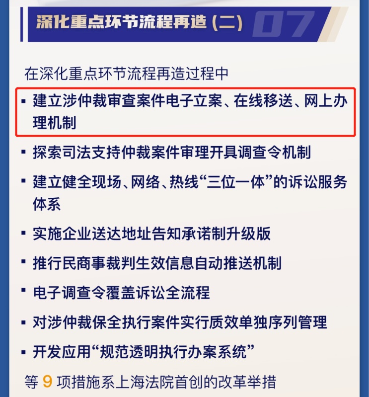 今年5月22日,上海市高级人民法院发布《上海法院推进法治化营商环境建设专项行动计划6.0版》(点击文字查看详情),在“深化重点环节流程再造”方面,推动建立涉仲裁审查案件电子立案、在线移送、网上办理机制。