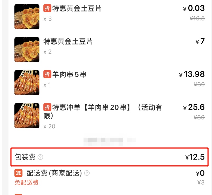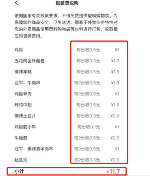 例如,某外卖平台一家名为“炭火工坊烧烤集市(肇嘉浜路店)”,每串外卖包装收取0.1元到0.5元不等,下单42串烤串,包装费总价(优惠前)达到11.7元,实际却只收到了2个外卖包装盒。在很多消费者看来,少用点包装盒消费者是支持的,但是包装费的收取方式却让消费者觉得不合理。