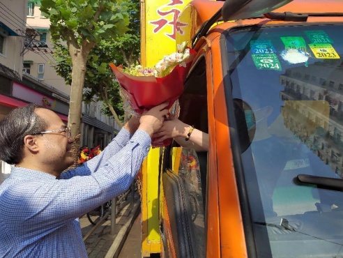 在简单热烈的欢送仪式上,静安区副区长李震、区“两旧”专班常务副主任徐健、区房管局局长李卿、芷江西路街道党工委书记王月庆、芷江西路街道办事处正处级领导陈捷、北方集团董事长陈卫东等领导为居民送上鲜花和祝福,祝愿居民早日搬回新房。