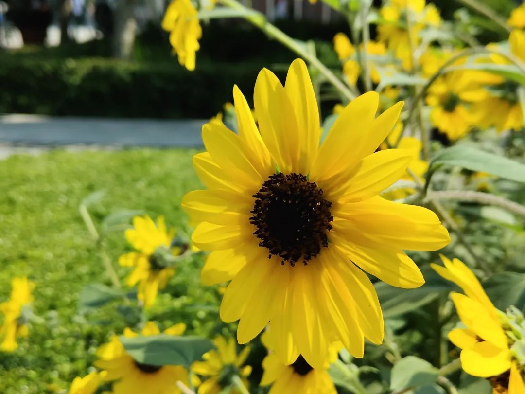 每到六月,金黄的向日葵花海就开始提醒人们夏天的到来,朵朵金黄都浮现着夏日的印记。在天光云影中,朵朵向日葵向阳而生,与湛蓝晴空一起,构成了一幅生机盎然的田园风光图。这片花开正盛的金色花海,就位于蒲西路158号中央广场的道路两侧。