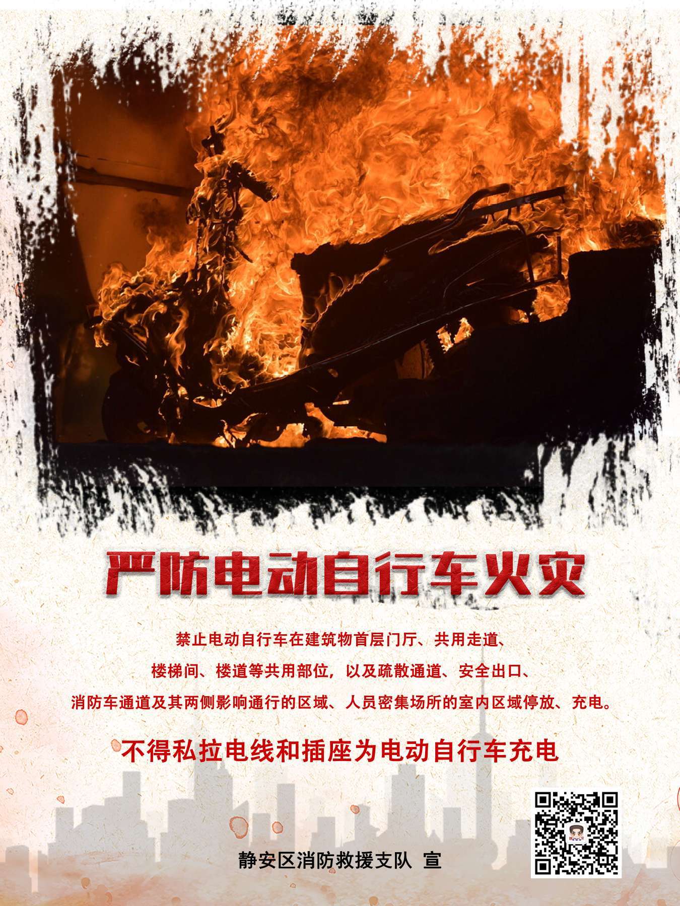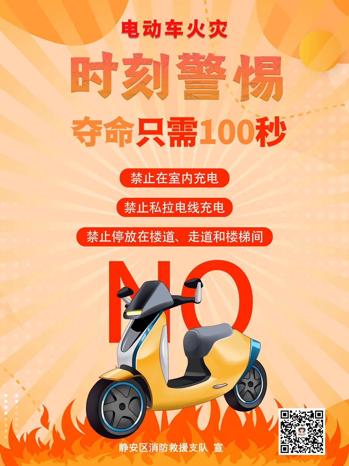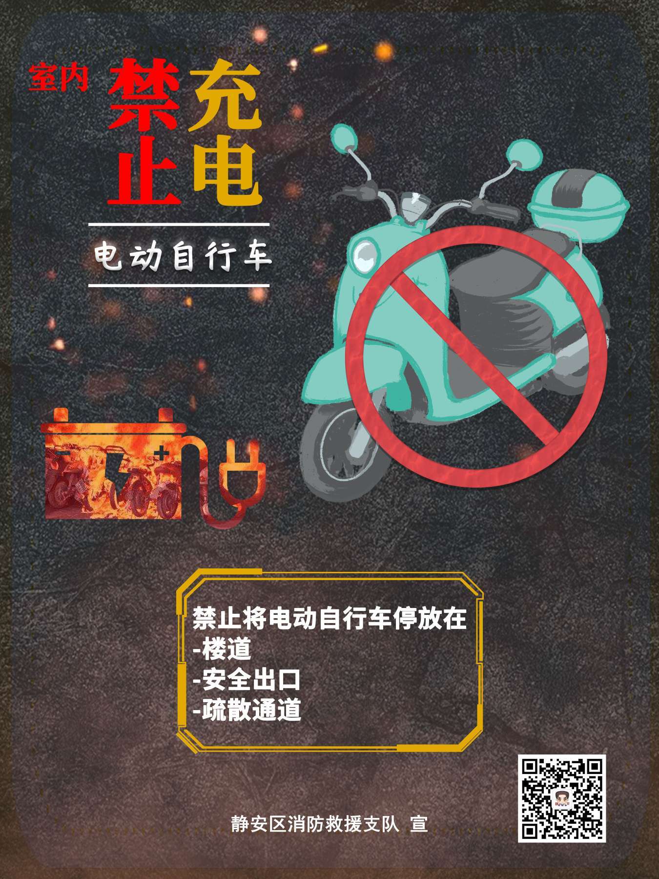 静安消防提醒您:请勿违规将电瓶拆下,拿到室内进行充电,不要违反用电安全要求私拉电线“飞线充电”。