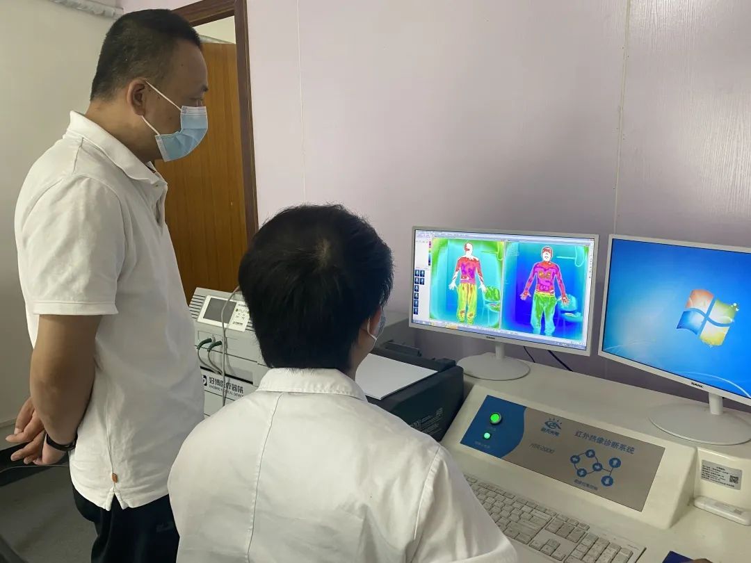 随后,治疗师又为谢先生做了红外热成像检测,热成像系统能够采集人体的温度,屏幕上的人体影像还会根据温度高低,呈现出红、黄、蓝、绿等颜色。红外热成像检测对热图进行分析以后,可以判断出人体病灶的部位、疾病寒热性质。倪俊磊说:“谢先生肚脐周边是偏寒的,我们建议他做8次肠胃艾灸,做完以后,可以再来做一次红外热成像检测,应该就有比较明显的对比。”