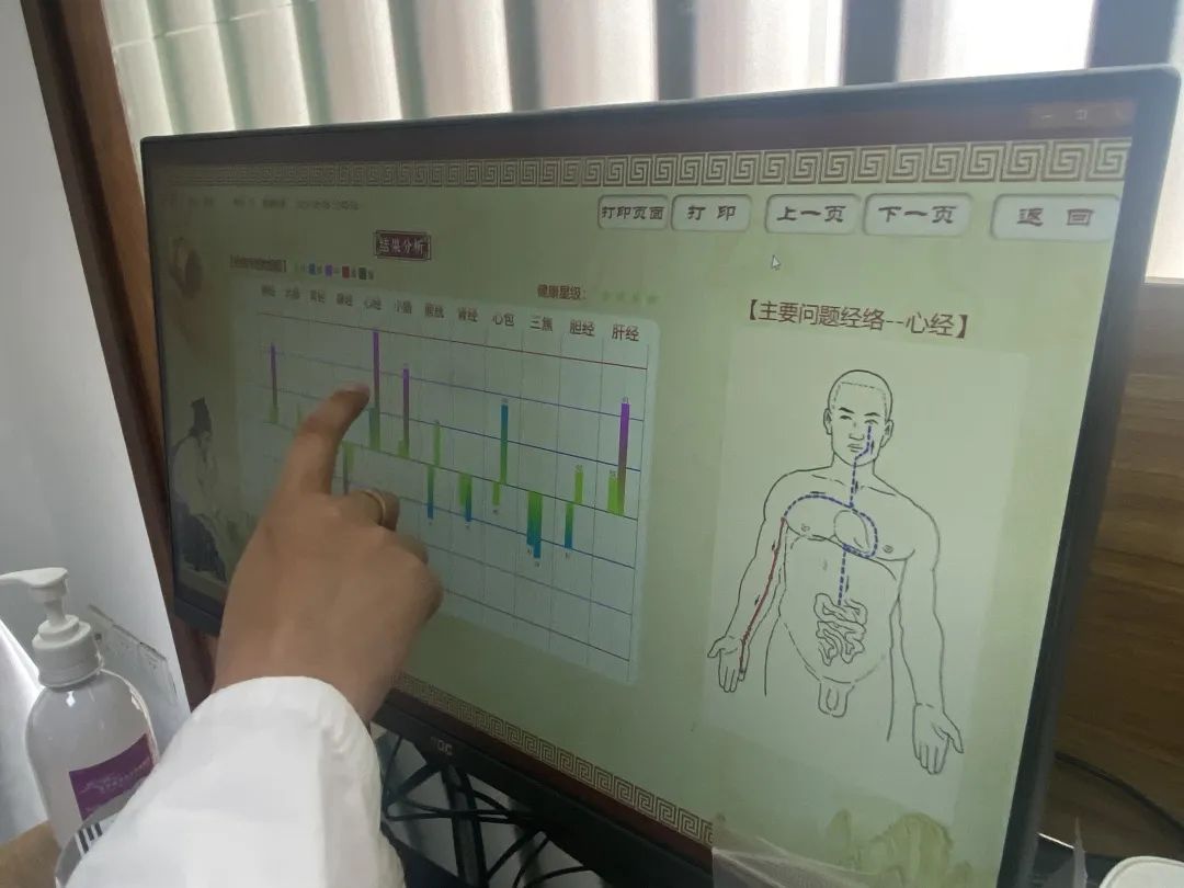 “你的小肠经肝经的指标是紫红色的,说明这两个经络比较虚,你腹泻的问题可能也是这个造成的。”治疗师倪俊磊让谢先生坐在病床上,同时用中医经络检测仪的探头点测手部以及脚部的相关穴位。几分钟过后,仪器的屏幕上就显示出心经、肺经、肝经等12个经络的情况。“经络是我们身体内运行气血、联系脏腑和体表以及全身各部的通道。通过经络检测,可以分析个人的机能整体变化与五脏六腑的健康状况,明确十二经络的虚实状态。”倪俊磊告诉记者。