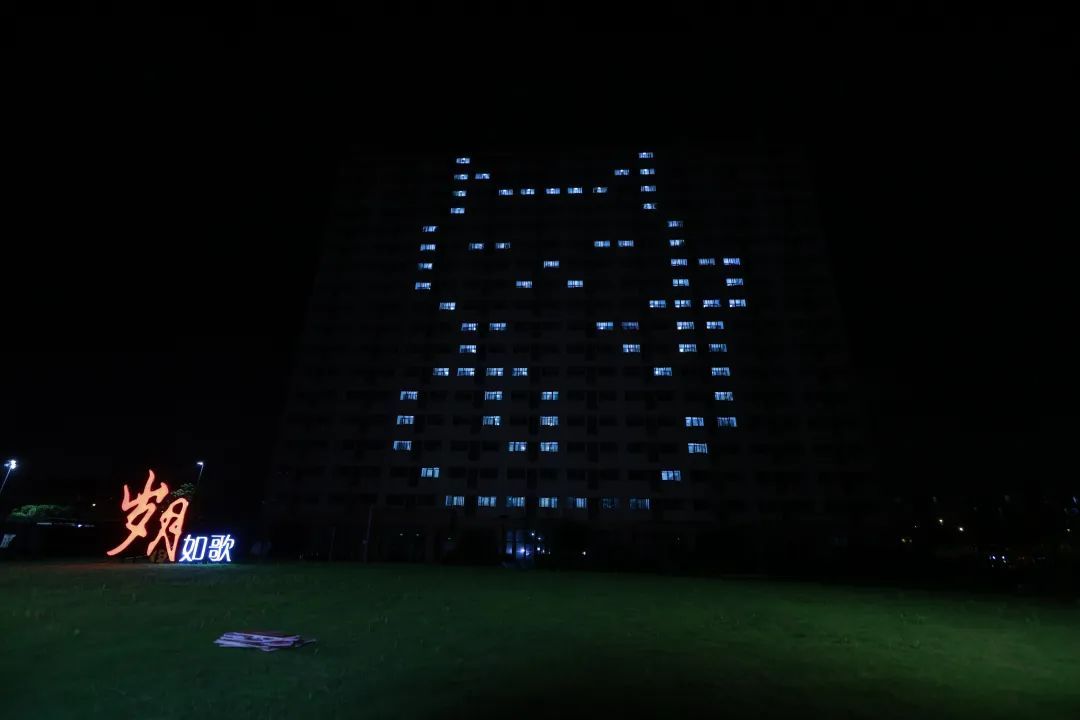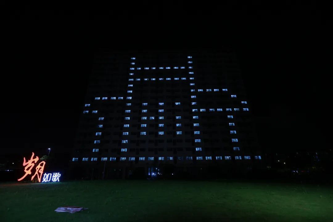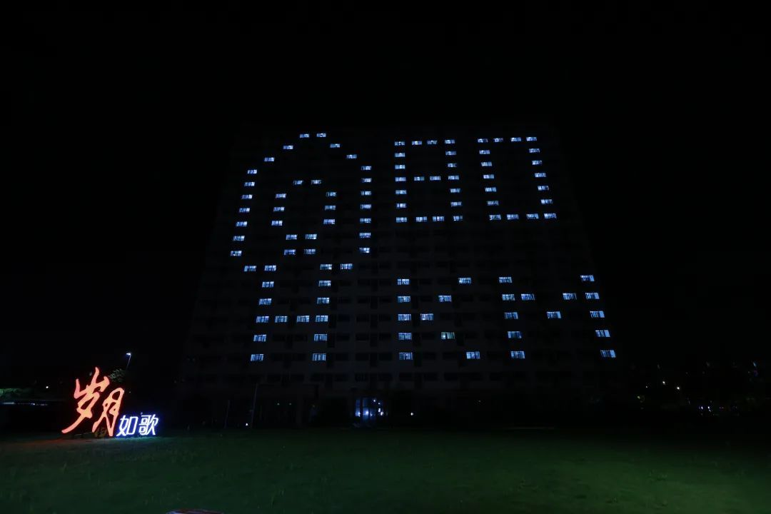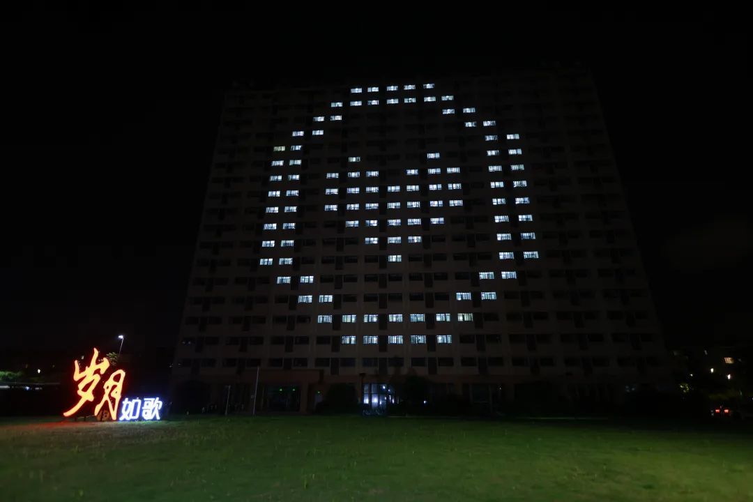 随着草坪音乐节最后一首《不说再见》的歌声余韵,校内亮灯仪式悄然开始。一张带有“SUFE”的爱心图案首先点亮了上财的夜空,拉开了亮灯仪式告白母校、奔赴未来的序幕。