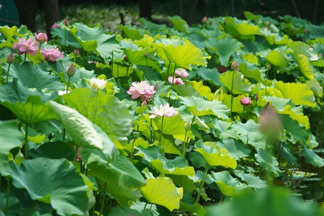 园内800多平方米的水塘里,种植了大洒锦、一丈青、黄飞舞等10多种精品荷花,以及具有耐寒基因的新品种三水冬荷,预计半个月后达到盛花期,花期一般持续到10月。公园对外免费开放,早上6点开园,晚上9点闭园。