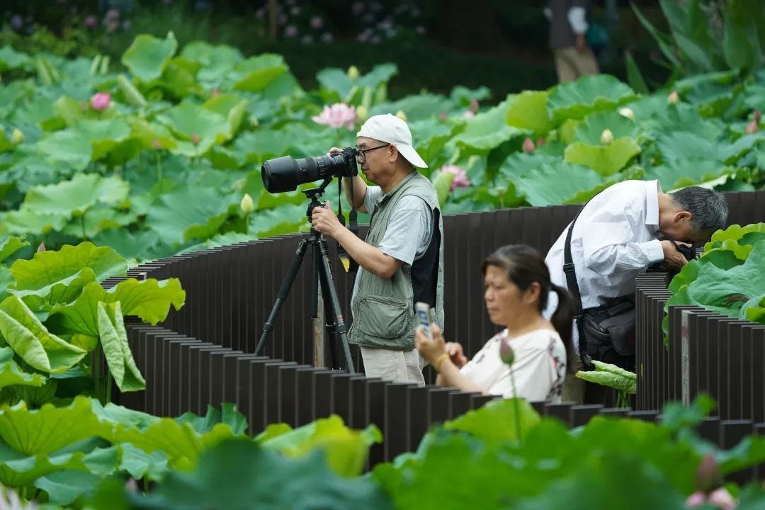 每年初夏,陈家山荷花公园里的荷花总会率先开放,成为摄影爱好者的天堂。在静静的荷塘边,摄影爱好者们站成一排,目不转睛地盯着某个方向,按下快门,生怕错过难得的瞬间。摄像爱好者马先生说:“这里的荷花品种多,花期也特别早,今天光线特别好,很适合拍摄。”