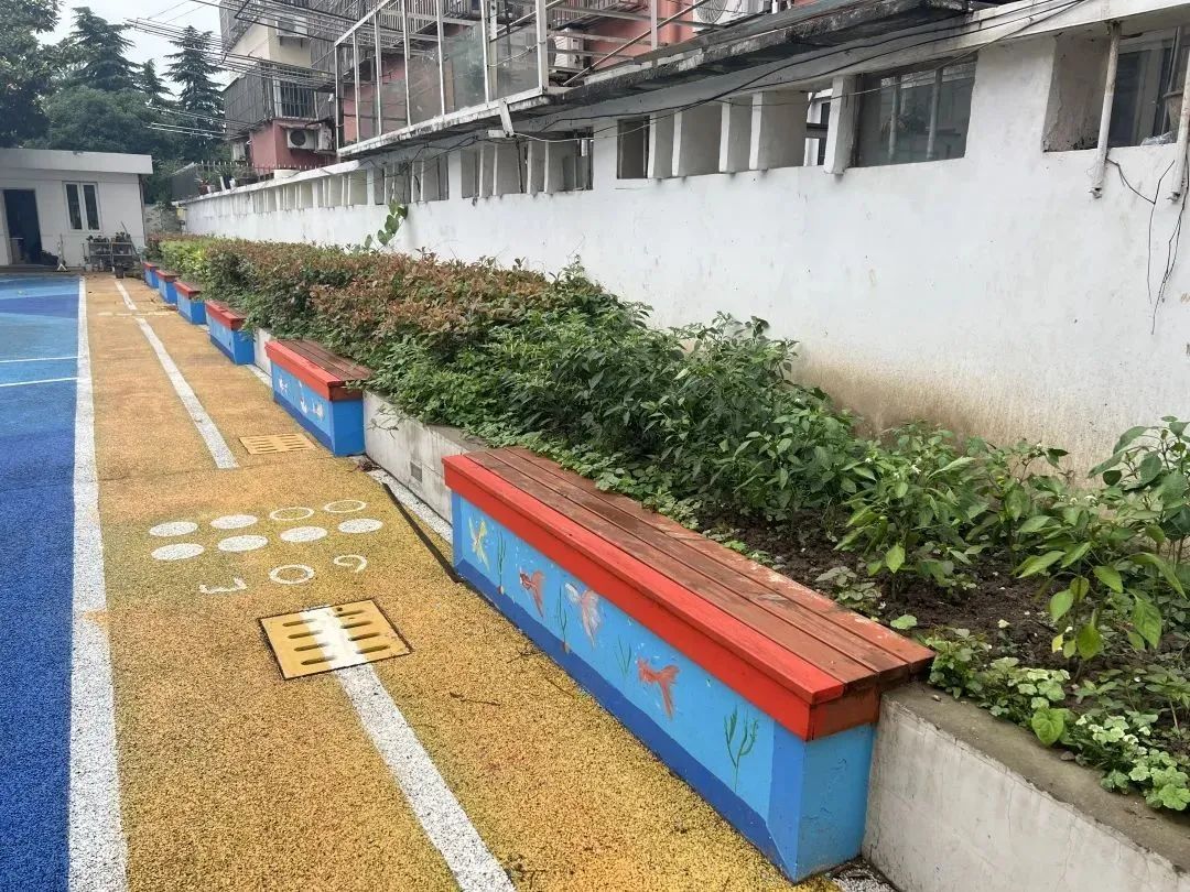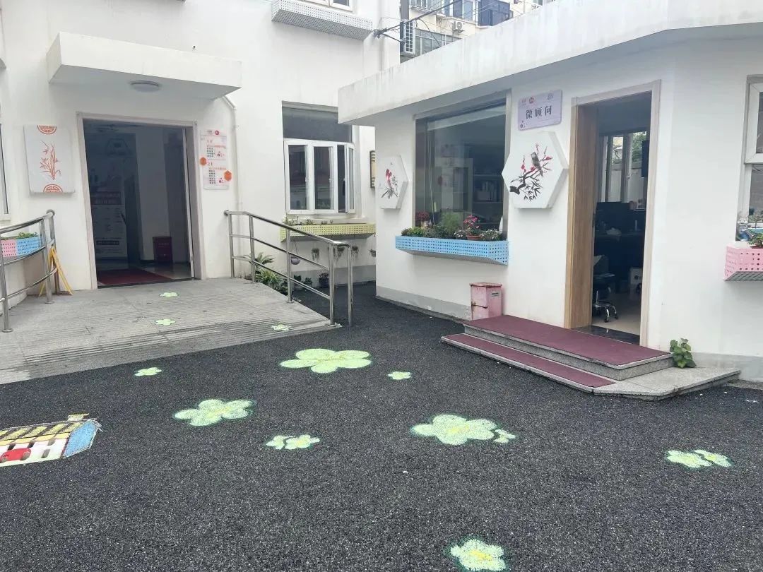 值得一提的是,此次升级改造还大大美化了养老服务站周围的环境。走近绿梅社区家门口养老服务站,放眼望去都是充满童趣味的画作,地面上有迷宫、脚印、绿色梅花等,座椅上、墙面上等也有许多五颜六色的画作,这些画作是工作人员和日托老年人一起完成的。