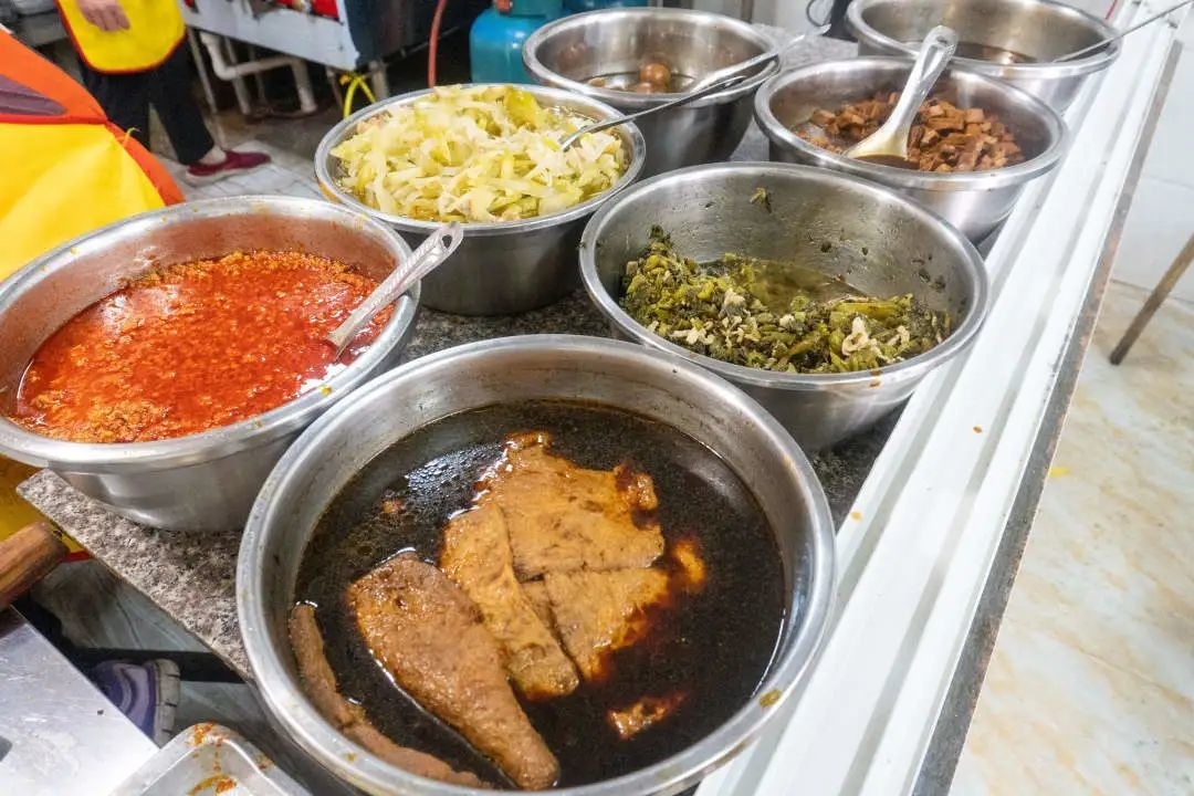 店里的阿姨也在这家店工作有十多年了,只见她忙里忙外,给顾客上完面又进厨房去下面,忙里忙外但却不乏热情招待,“你们想加什么菜,想要多少跟我说。”阿姨会问顾客们加什么配菜,帮顾客添加他们想要的配菜并送到他们桌上。有时候一些老顾客会自己来到配料区,按照自己的喜好添加配菜,没一会儿,一碗面上便铺满了各种各样的配菜。