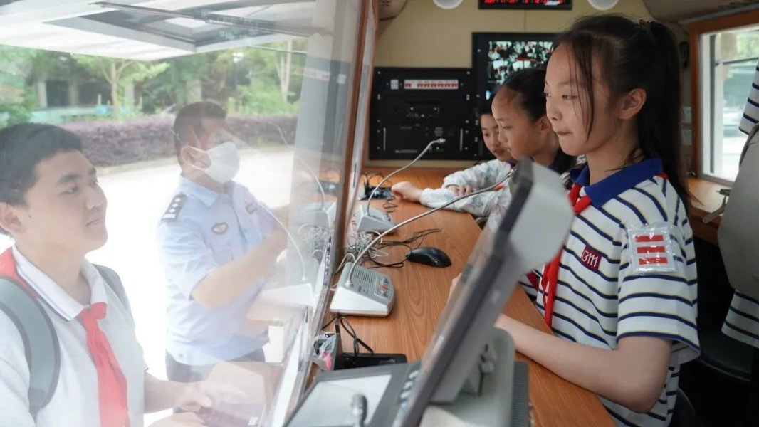 “同学们,欢迎来到上海机场边检站,我们是一支守在祖国东方国门的移民管理队伍……”活动开场,机场边检站的移民管理警察向红领巾讲解员们介绍了移民管理职能及中国护照常识,随后指导大家在该站证件研究中心、移动验放车内模拟出入境人员查验工作。
