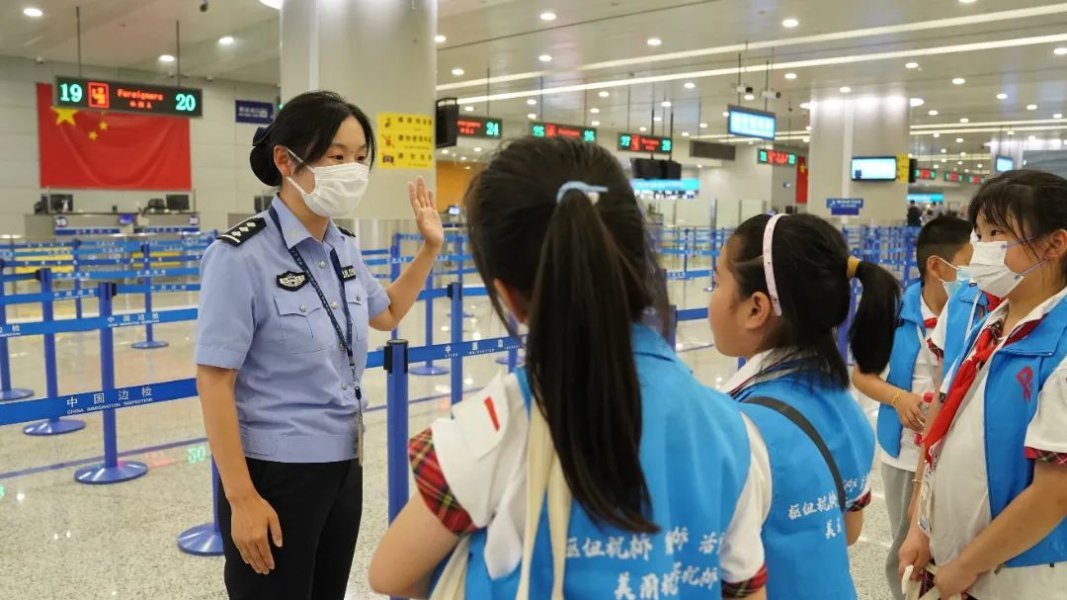 红领巾讲解员还实地参观了该站勤务指挥中心、出入境执勤大厅,驻足观看移民管理警察的工作日常,亲身感受国门卫士昼夜不停守卫浦东机场口岸的艰辛与不易。同学们纷纷表达了“从小学先锋,长大守国门”的强烈愿望。“我要学好科学技术,长大后成为一名移民管理警察,为国家贡献力量。”来自上海市实验学校附属光明学校五年级学生吕明迅表达了自己的愿望。