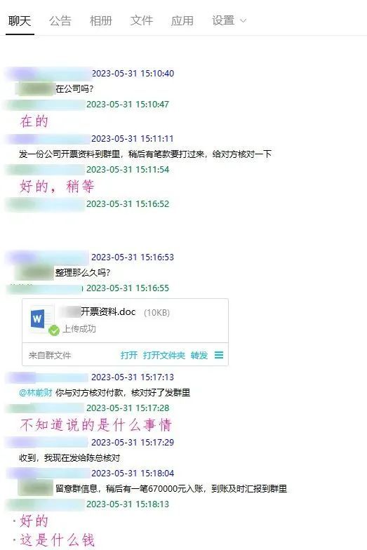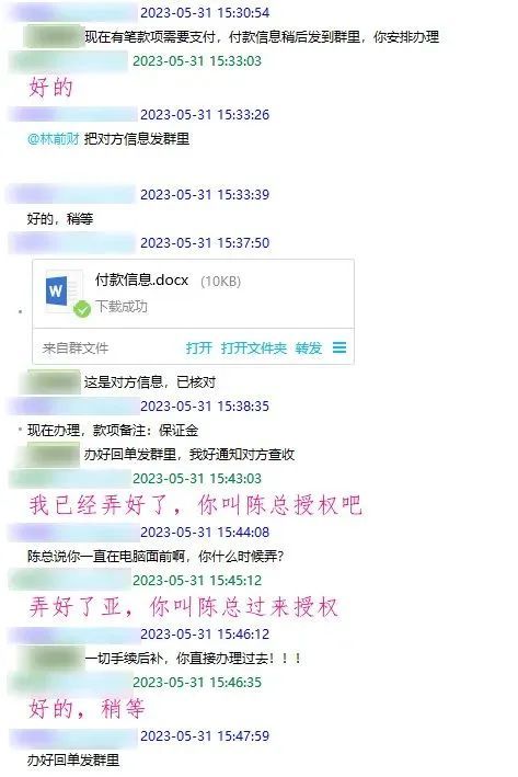 群内有署名为公司老板余先生的账号,及另外两名陌生人的账号。起初,沈女士以为是公司正常业务,遂向群内“老板”提供了公司账户余额等信息,随后“老板”以汇保证金为由,让沈女士向陌生人员提供的账户立即汇款98万元。