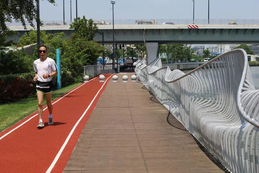 接近正午,这里有不少跑者。他们有男有女,有老有少,穿着专业的运动着装,稳速前行。还有老奶奶在遛娃,老爷叔在玩空竹。