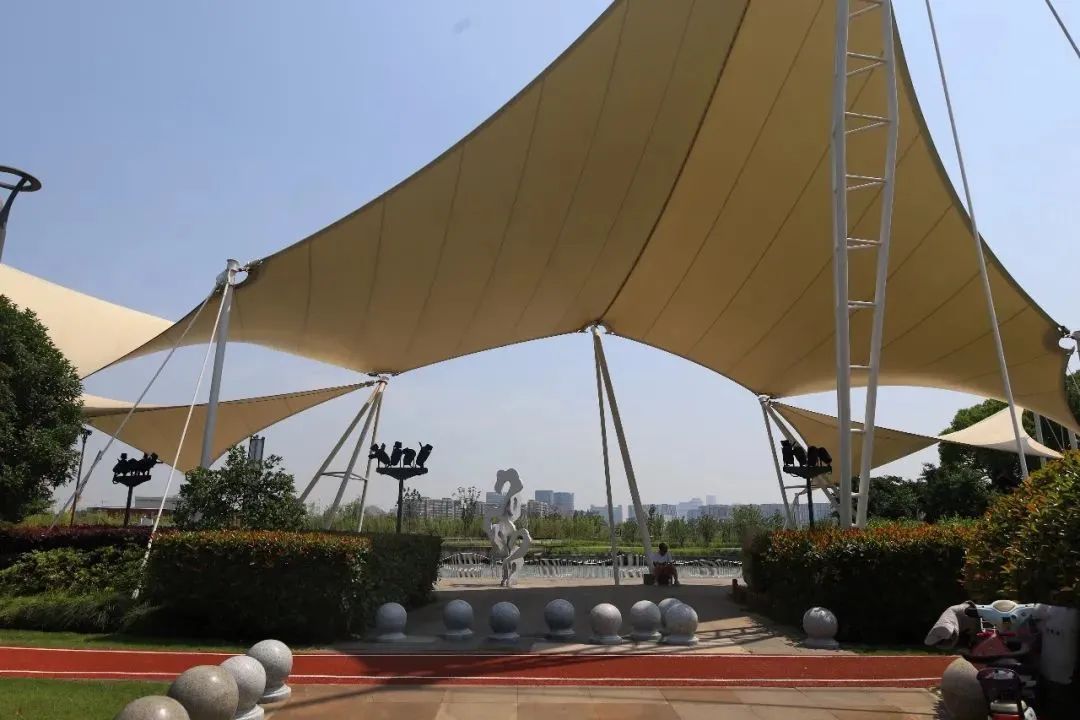 看得到苏州河风景的广场拥有好几座拉膜亭,它们连成一片,就像舟楫扬起风帆,即将远航。