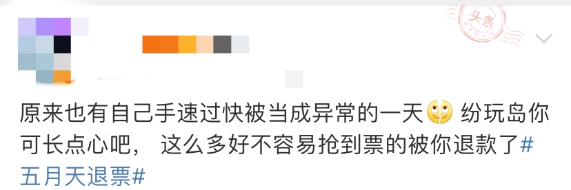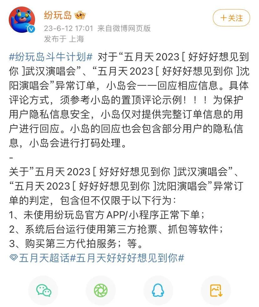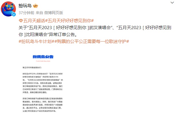 对于网友反映出来的退票问题,演唱会主办方纷玩岛在官微做出了回应,发布了关于“五月天2023[好好好想见到你]武汉演唱会”“五月天2023[好好好想见到你]沈阳演唱会”异常订单的公告。