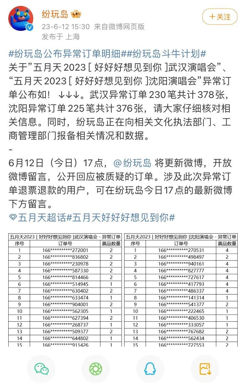 6月12日15:30,纷玩岛在微博公布异常订单明细。