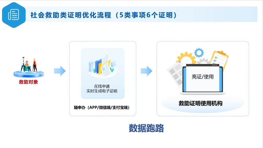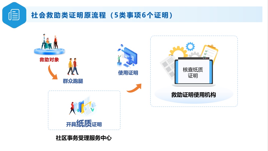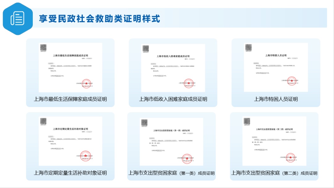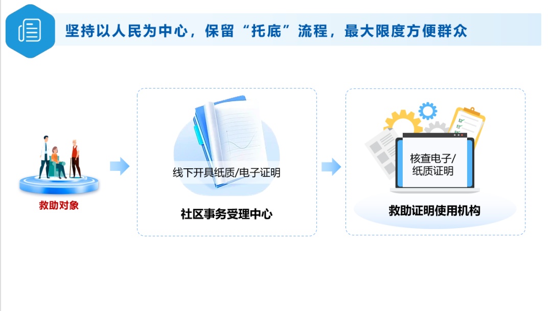 市政府办公厅、市民政局聚焦数字化转型,全面梳理需在社区事务受理中心办理的享受民政社会救助类证明材料,并会同市大数据中心全部实现电子证照制发和数据共享。过去一年,上述材料的线下出证量近8.6万张。如今,相关市民群体通过“随申办”手机端,就能线上申领,只需“亮证”功能,就能办理相关事项。目前,已开具相关电子证明6550多件次,6月9日开通线上申请功能以来,已收到申请80余人次。数字化时代还要注重人性化关怀,各社区事务受理中心窗口将继续保留线下申请和开具证明的通道,方便不经常使用电子设备的市民。教育系统也将留出减免学杂费政策的“反向勾选”通道,尊重家庭教育选择。