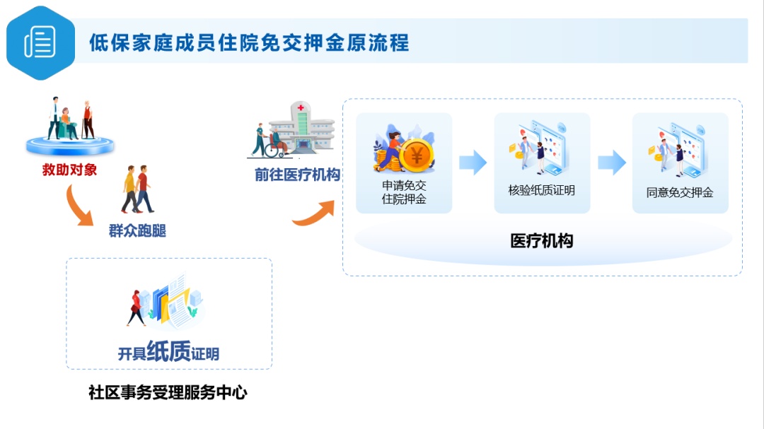 以往,本市低保人员到医院住院办理押金减免手续时,须提供街镇社区事务受理中心开具的低保证明。而开证明这件事,在实际操作中却有诸多不便——市民为了办证不得不来回奔波,腿脚不便或者上了年纪的独居孤寡办理者,到社区事务受理中心办事耗时耗力,申请享受便利的过程并不便利。
