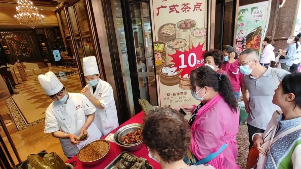 在南京东路步行街,为了吸引消费者,新雅粤菜馆甚至在门口架起了摊子,向往来顾客展示包粽子的过程,吸引了不少消费者围观、购买。