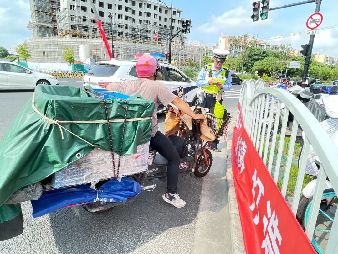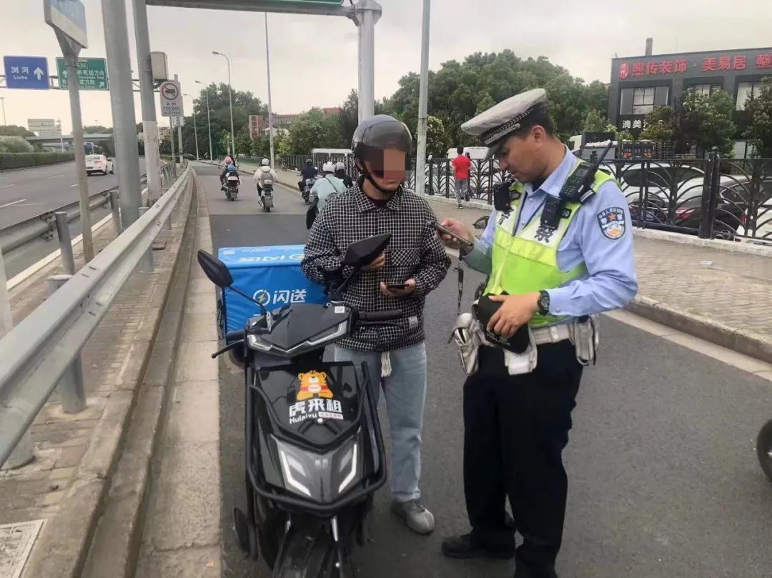2023年6月12日7时30分,松江交警在荣乐东路联阳路路口,对当事人段某实施“从事快递、外卖等网约配送活动未按规定使用悬挂专用号牌的电动自行车的”违法行为,处以罚款50元。