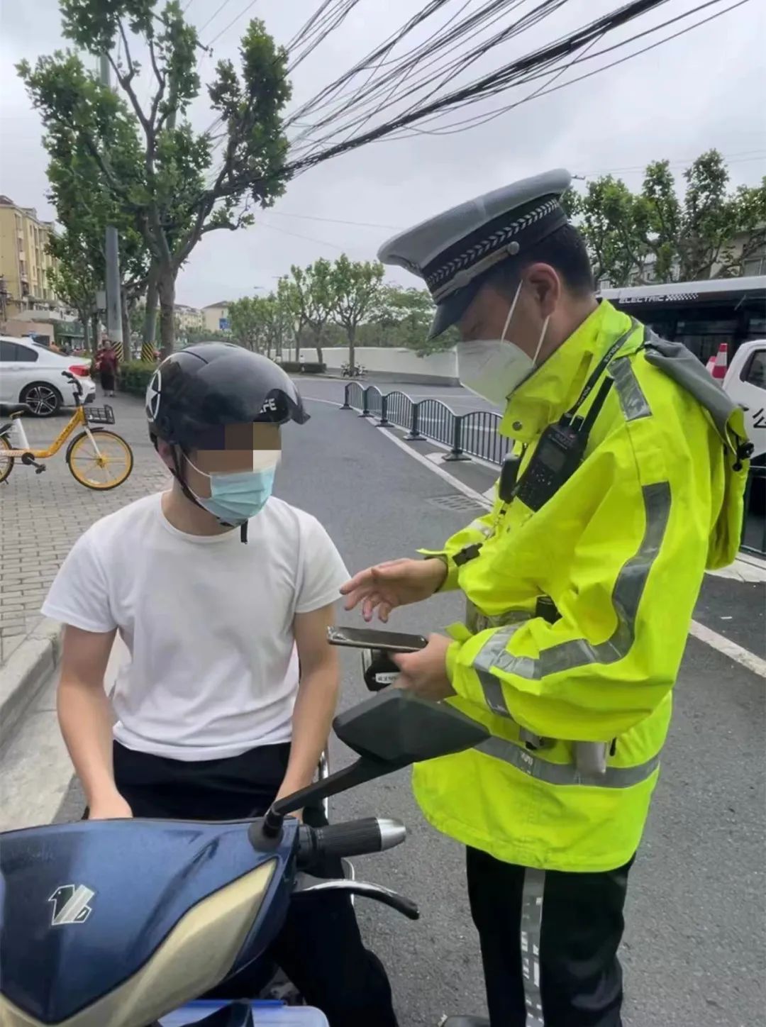 6月13日11时08分,浦东交警在金杨路近枣庄路西约100米处,对当事人樊某实施“电动自行车驾驶人未佩戴安全头盔的(未系安全扣)”违法行为,处以警告处罚。