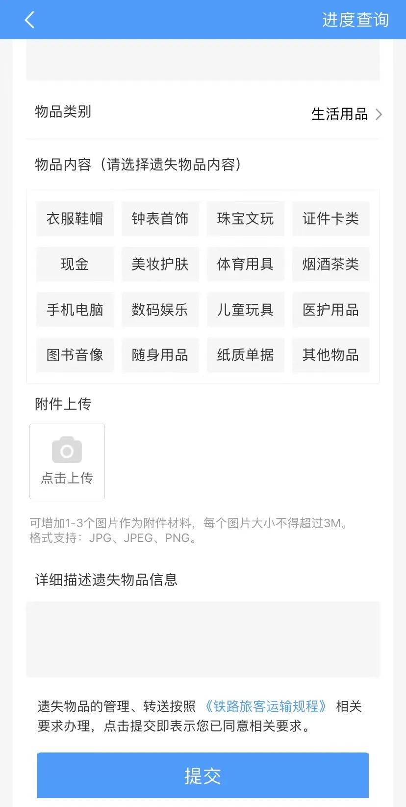 首先,下载官方APP,点击右下角【我的】,找到并进入【遗失物品】。根据要求填写相关信息,最后提交信息即可。