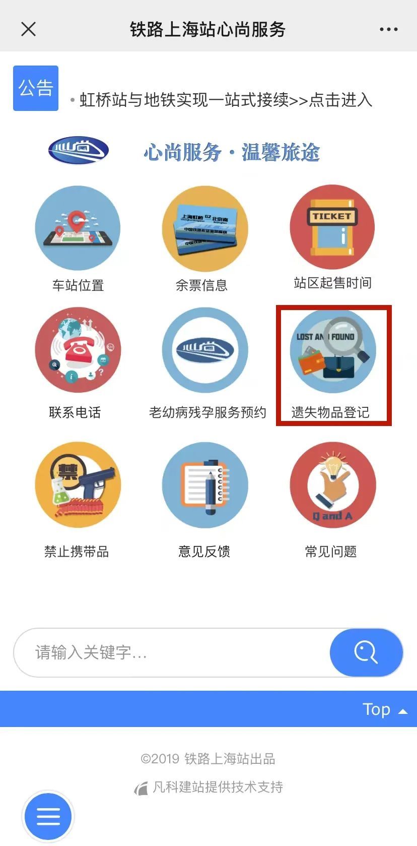 点击“铁路上海站”微信公众号界面下方菜单【心尚服务】,进入【遗失物品登记】。根据要求填写相关信息,最后点击【提交】即可。