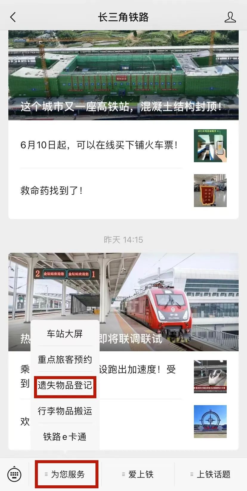 点击“长三角铁路”微信公众号界面下方菜单【为您服务】,进入【遗失物品登记】。根据要求填写相关信息,最后提交信息即可。