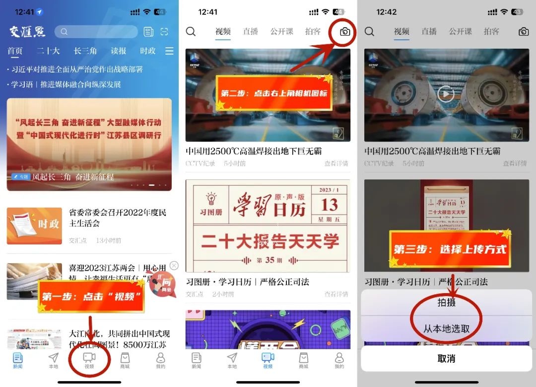 登录交汇点新闻客户端,点击底部“视频”栏目的“拍客”节点,即可上传照片视频。